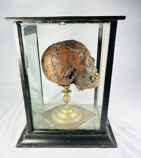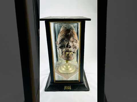 Descubra una cabeza momificada del siglo XIX , rara e históricamente significativa, elaborada en arcilla y con dientes humanos auténticos . Montada sobre una base de latón y protegida por una vitrina de madera y vidrio a medida, esta macabra reliquia es una pieza fascinante de la historia del circo y los espectáculos secundarios .