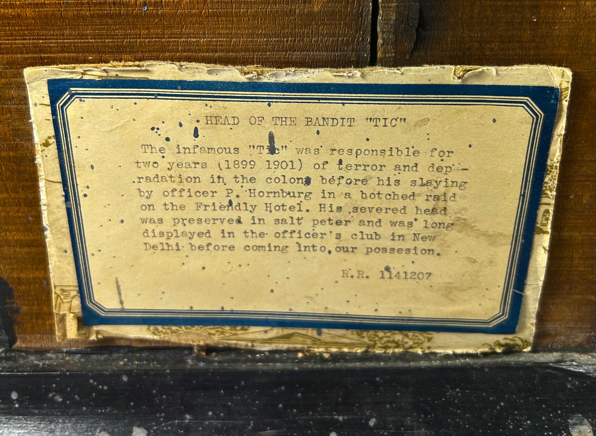 Conocida como « TIC », esta cabeza momificada tiene una rica procedencia, pues perteneció a un conocido bandido colonial . Tras su muerte en 1901, la cabeza de TIC se conservó en salitre y recorrió el circuito de espectáculos, cautivando al público en carnavales y espectáculos de fenómenos a principios del siglo XX.