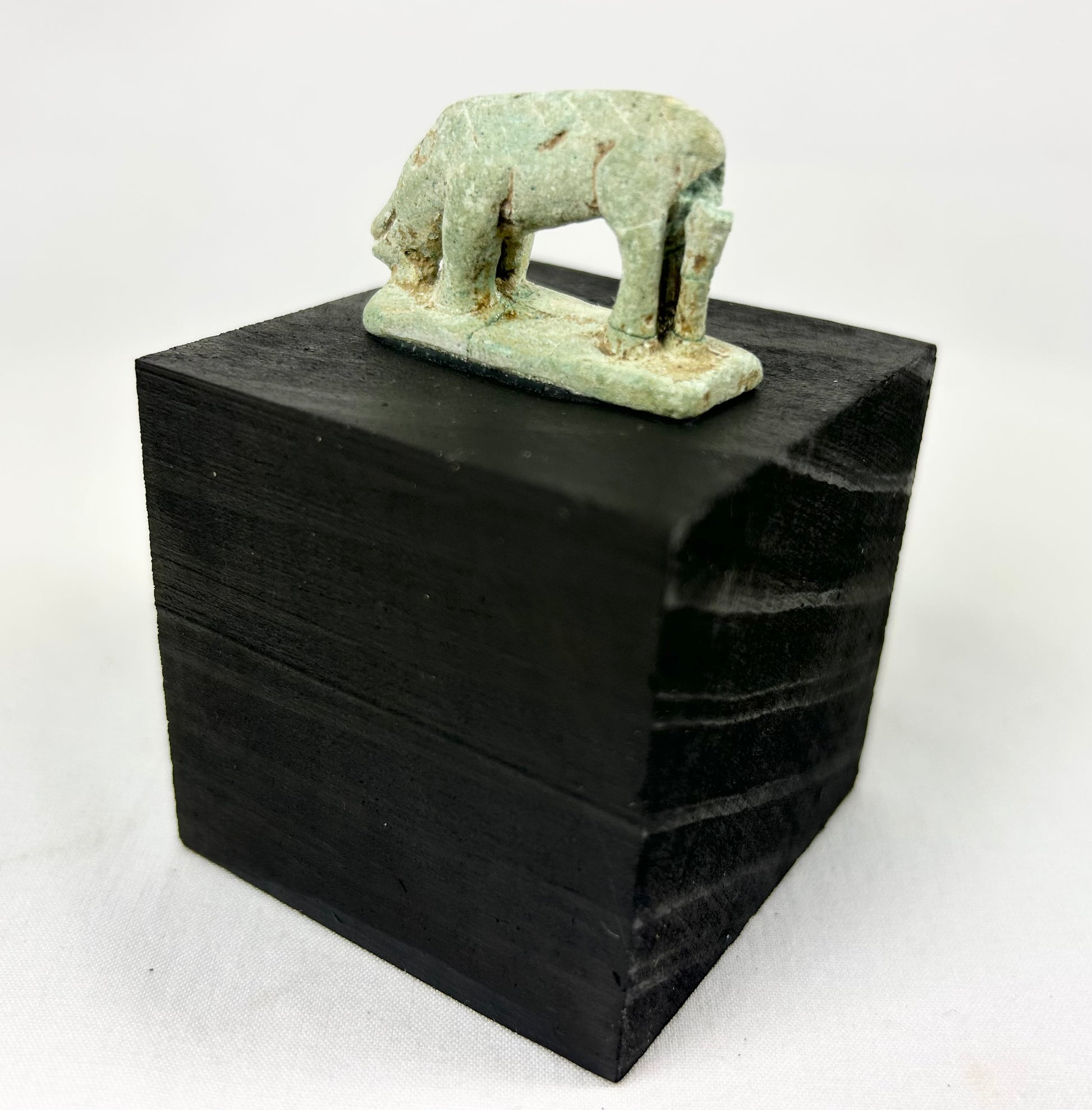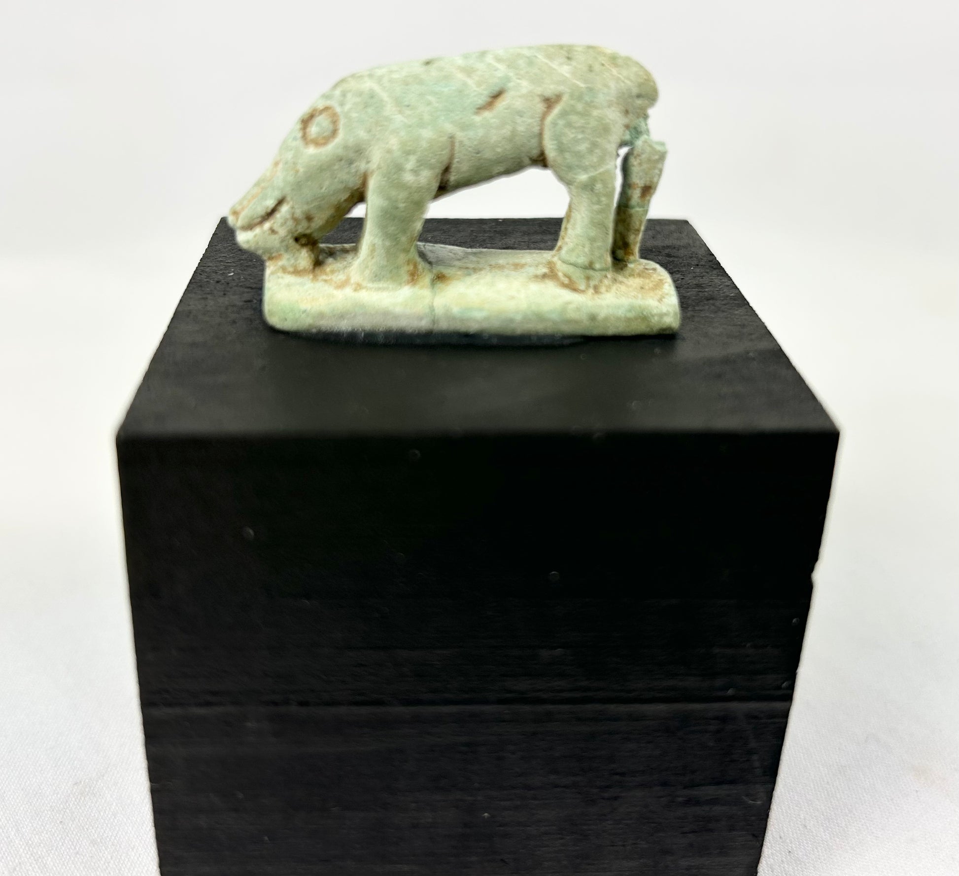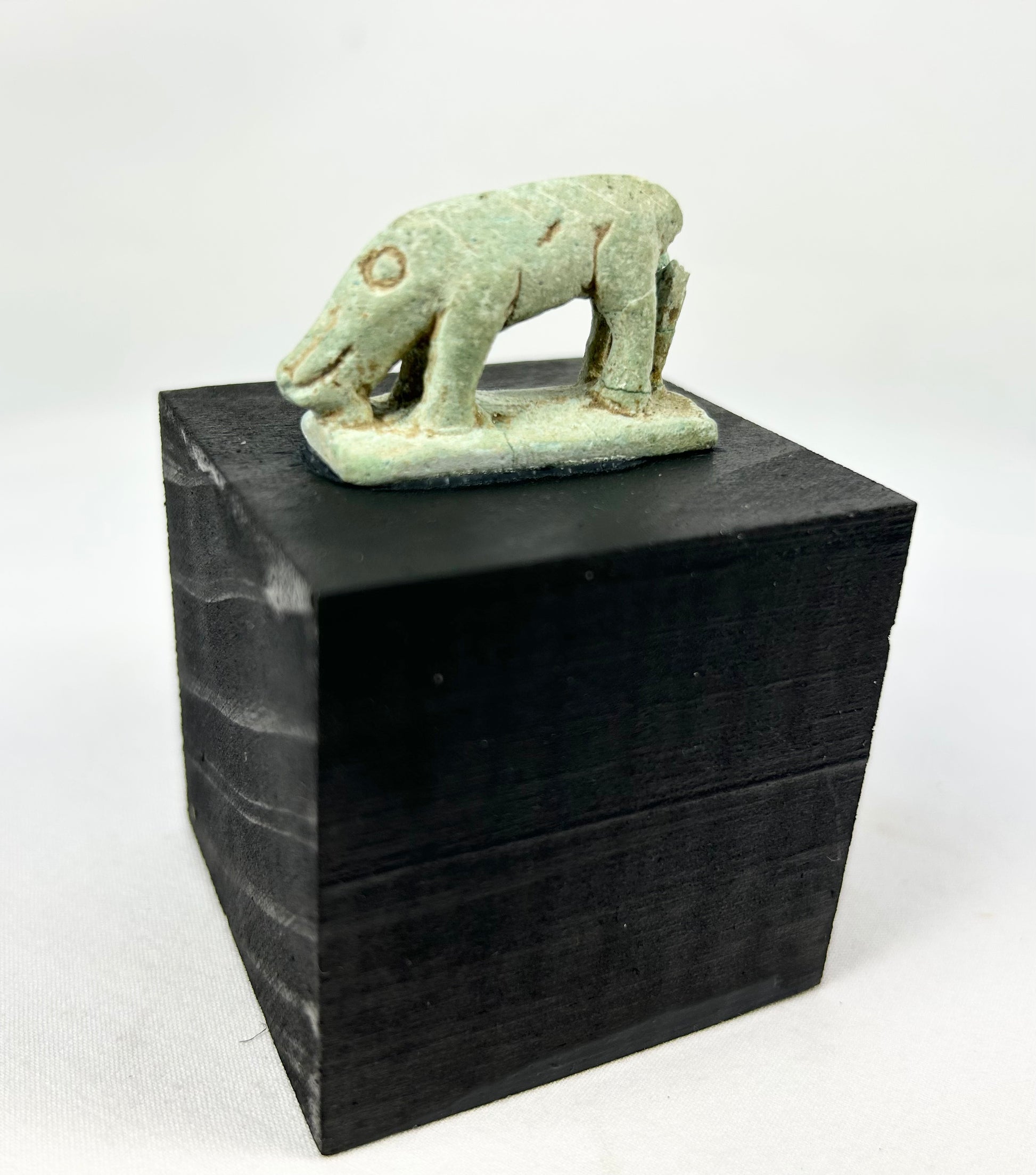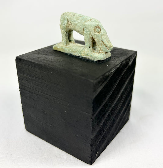 Amuleto de loza en miniatura de una musaraña (a menudo llamada "ratón musaraña"), modelado con un hocico alargado y volcado hacia abajo, un ojo con anillos y puntos, y cuatro patas atenuadas sobre una base rectangular. Un pequeño puntal dorsal tras los cuartos traseros refuerza la figura, mientras que unas ligeras líneas incisas sugieren el pelaje del animal. Se conservan restos del vidriado verde original, junto con las acumulaciones minerales del entierro. Se presenta sobre una peana moderna de madera negra.