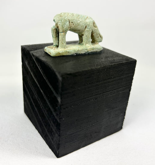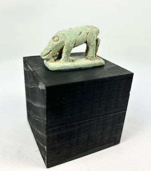 Aunque a veces se confunden con figuras de "cerdas verdes" de la diosa del cielo, el hocico largo y estrecho, las patas delgadas y el puntal trasero son características distintivas de los amuletos egipcios de musaraña. Las musarañas eran veneradas en los templos (especialmente en Letópolis) y se asociaban con la noche y poderes protectores. Los amuletos de fayenza de este tipo se usaban para protección personal y también se depositaban como ofrendas votivas.