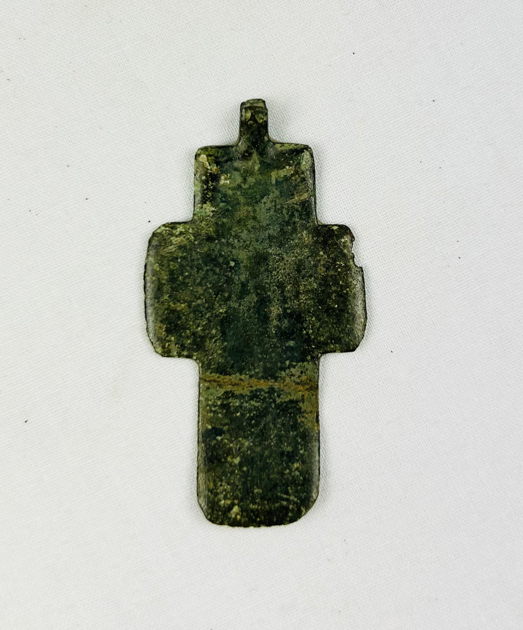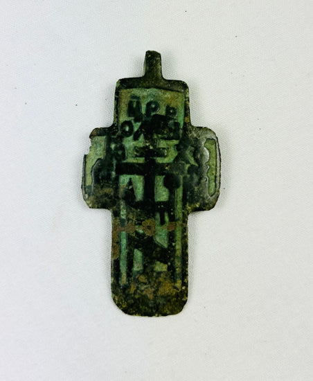Pequeña placa de cruz devocional ortodoxa, ideal para llevar, del entorno de los Viejos Creyentes. Fundida en aleación de cobre con incrustaciones de esmalte verde en huecos champlevé. La cara presenta inscripciones cirílicas cuadradas dispuestas en paneles; el reverso está liso por el uso. Asa corta para colgar en la parte superior (desgastada). Atractiva pátina de oliva/malaquita con restos de esmalte original.
