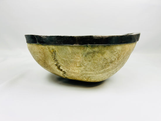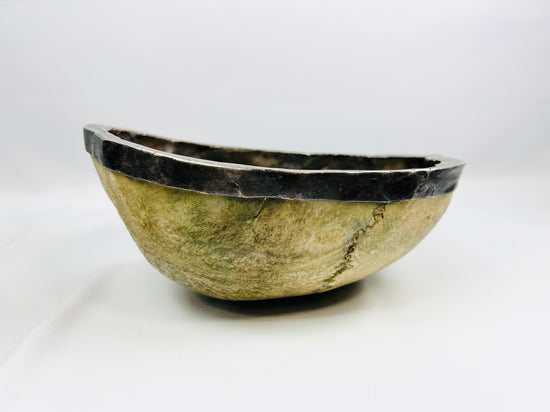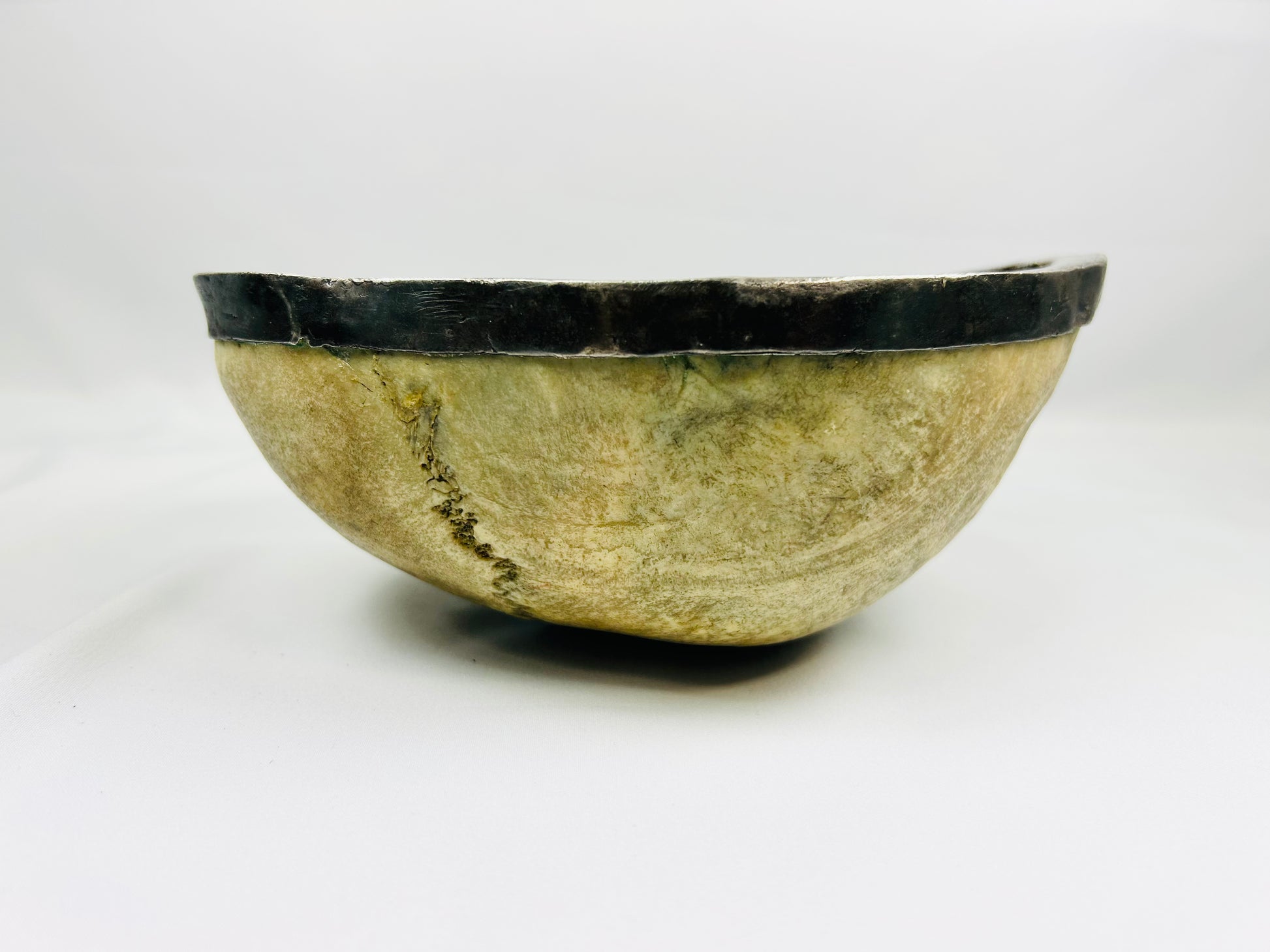 Una kapala (copa ritual de cráneo) finamente pulida, cuidadosamente trabajada para revelar las suturas naturales y la pátina del hueso. El recipiente está revestido con un revestimiento y una banda de plata alrededor del borde, combinando material sagrado con una refinada artesanía. La superficie conserva visibles el bregma y las suturas sagitales, lo que da testimonio de su autenticidad y origen. De forma sencilla pero con un profundo significado, la pieza refleja la humildad y la franqueza de la meditación budista sobre la impermanencia.