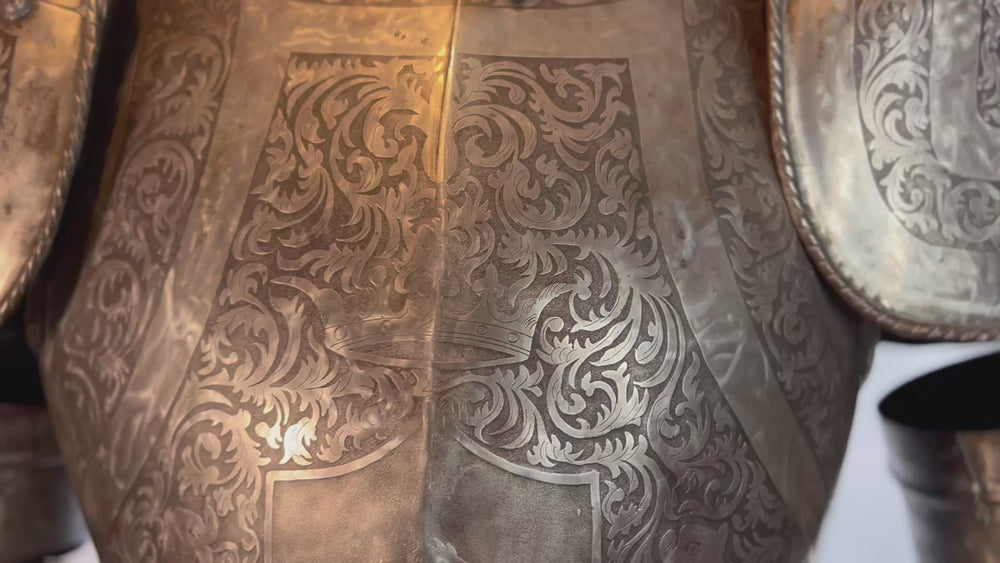 - Plastron et plaque dorsale richement ornés de gravures à l'acide :