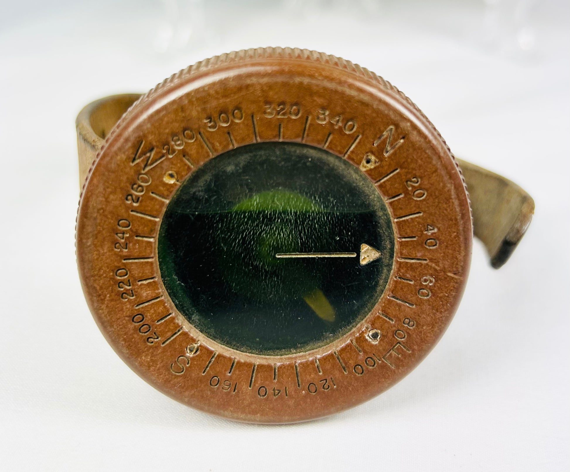Boussole : Bakélite intacte avec attaches de sangle ; aiguille réactive ; la pointe luminescente ne brille plus mais conserve des traces visibles