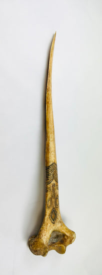 Material: Human femur (later tradition also cassowary bone) with natural pigment decoration and feather embellishments