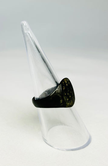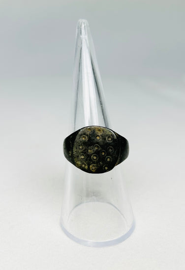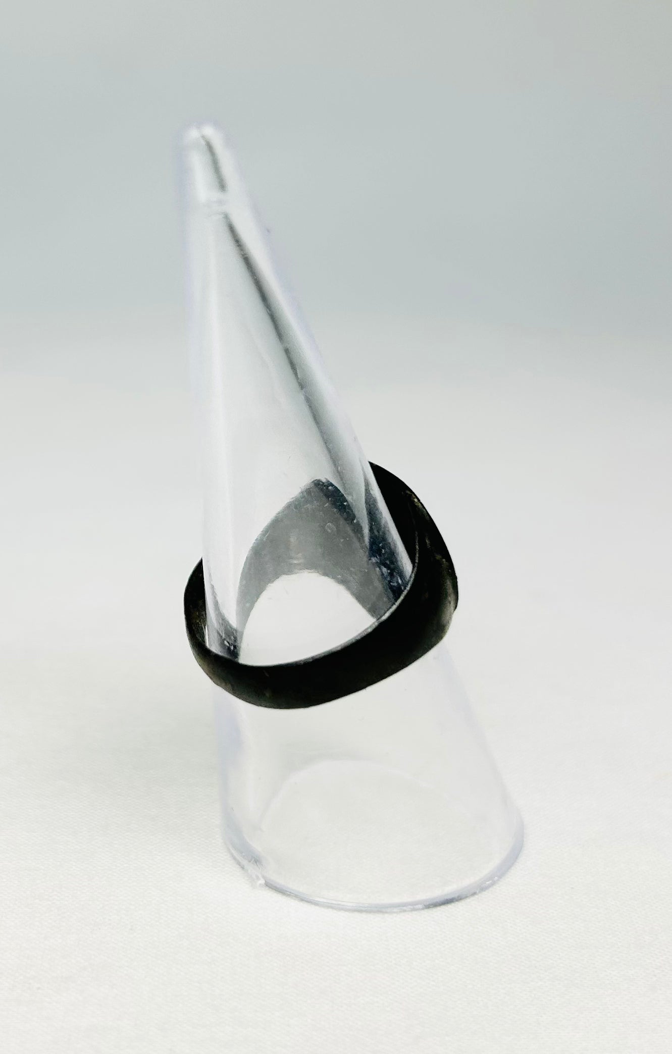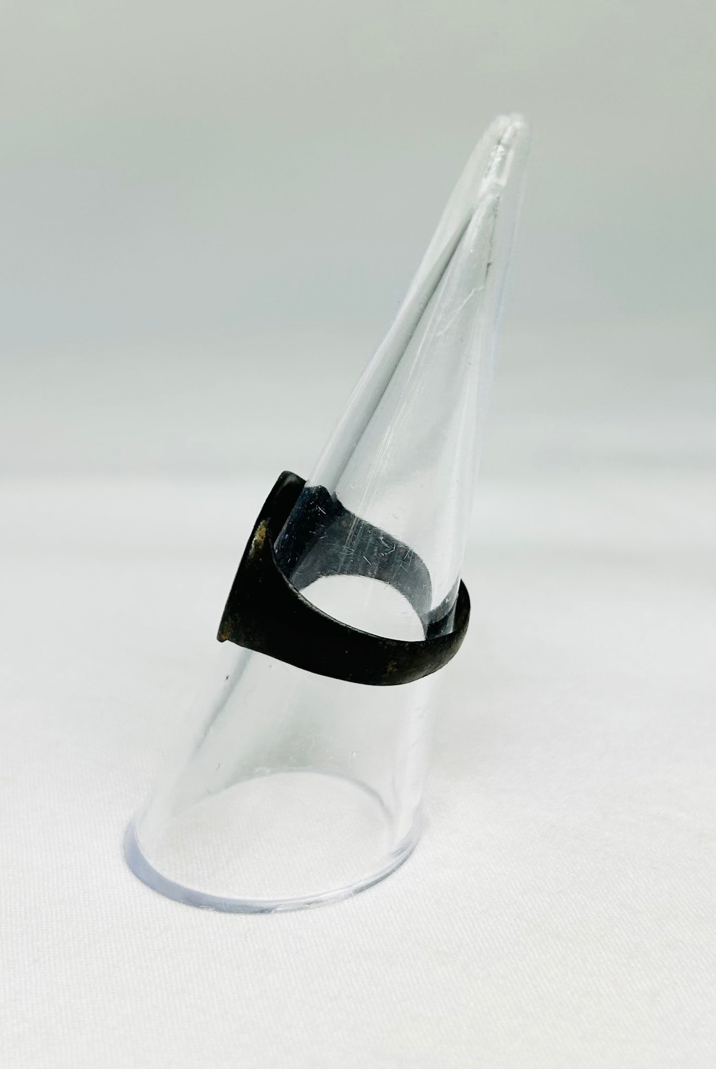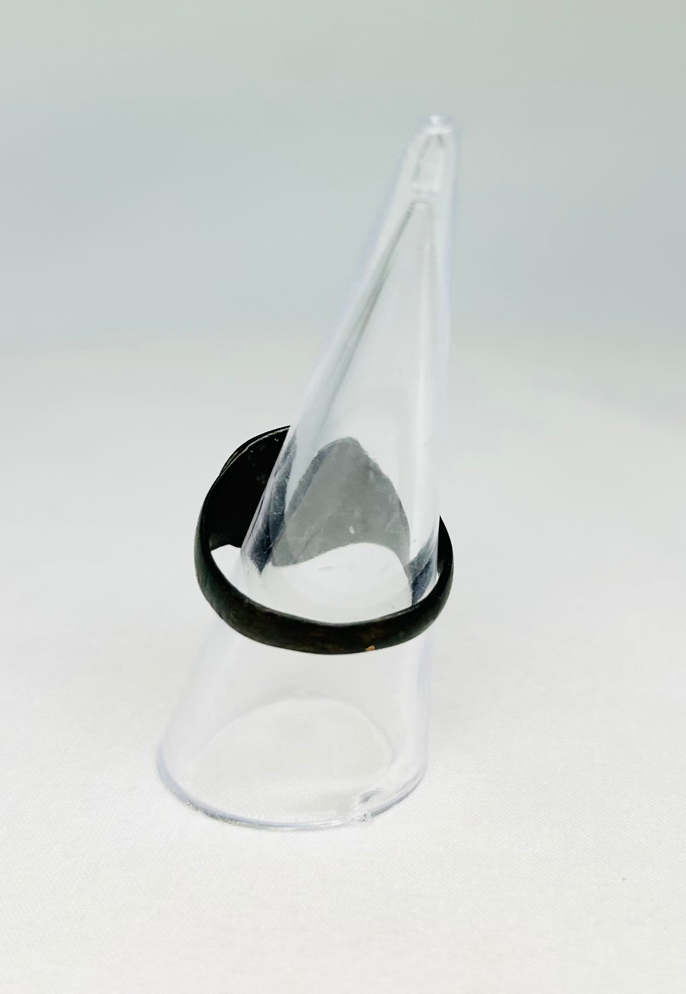 This bronze ring from the Roman period features a round hoop with a flat bezel adorned by irregularly placed “ring and dot” patterns, a motif commonly associated with solar symbolism. Measuring approximately size 7 US, the ring reflects Roman reverence for the sun as a divine life-giving force, integral to both religious and imperial ideology. The bold yet simple design combines functionality with spiritual meaning, serving as both adornment and talisman.