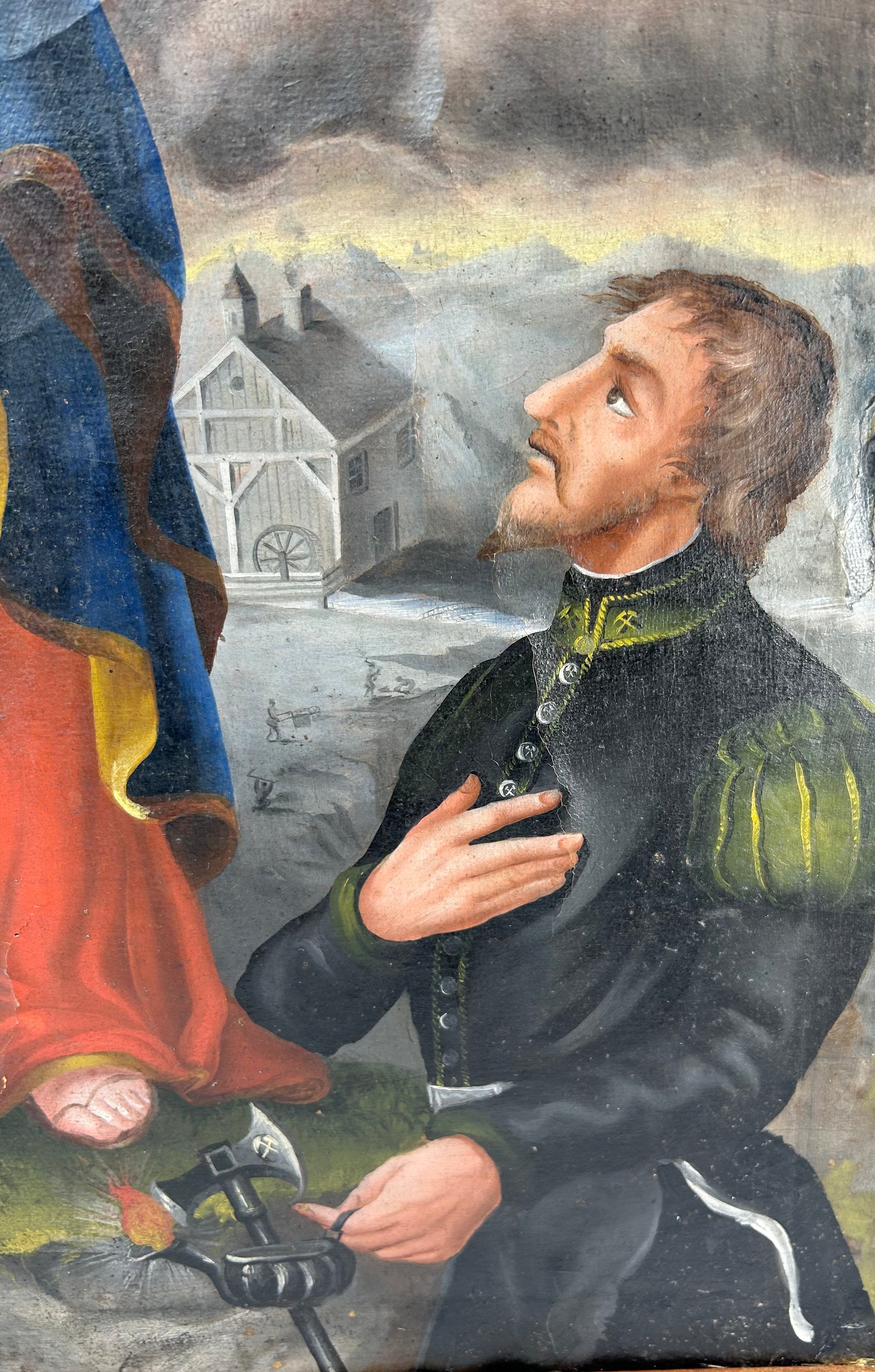 Dating Note: The donor’s European militia-style dress with green facings and buttoned coat, combined with simplified modeling and less brocade “estofado” than earlier works, points to a late 18th–early 19th-century provincial workshop. The canvas, now laid to panel, reflects a 19th-century conservation method common for Andean paintings.