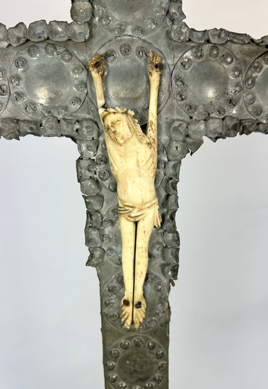 An evocative Spanish Colonial crucifix crafted from wood sheathed in hand-hammered tin repoussé, featuring a delicately carved bone figure of Christ. The tin covering displays raised circular and rosette motifs, symbolizing divine radiance and eternity. The reverse reveals the raw wooden structure with remnants of early paint and oxidation, testifying to its devotional age. Measuring 18 inches high, this piece reflects the powerful religious artistry of the colonial period.