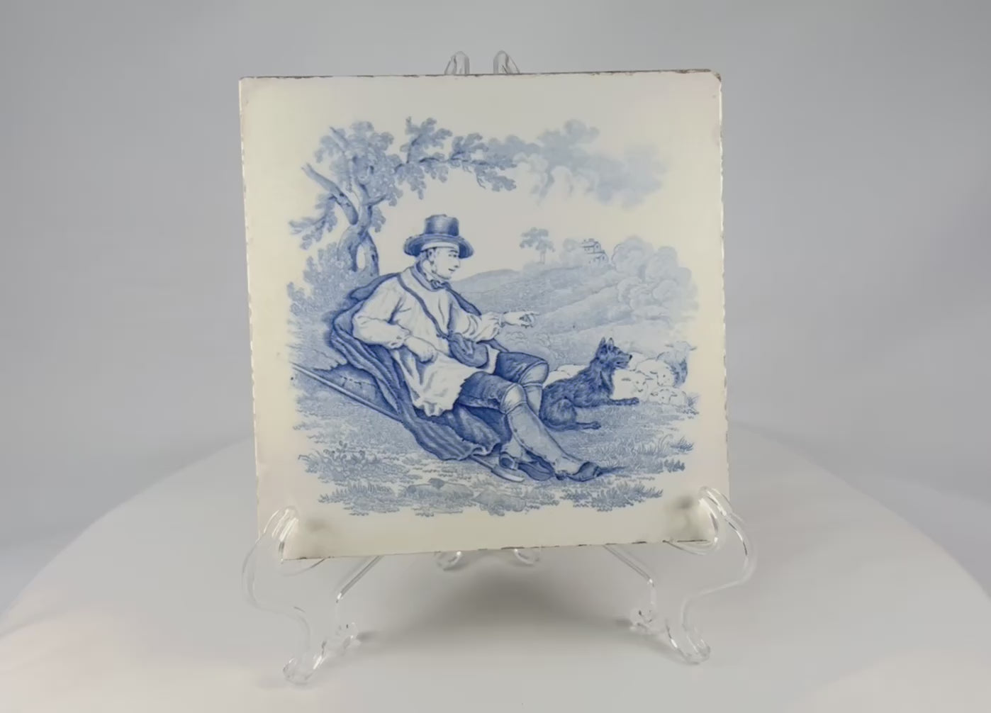 This decorative ceramic tile, attributed to the renowned Staffordshire maker Minton, exemplifies the Victorian fascination with pastoral imagery in domestic design. Transfer-printed in cobalt blue, it depicts a seated shepherd beneath a stylized tree with grazing sheep at his side, evoking an idealized rural idyll. The reverse retains raised ridges and impressed factory markings typical of Minton’s late 19th-century production, confirming its origin. Likely intended for use in fireplace surrounds or wall decoration, the tile reflects both artistic refinement and the functional craftsmanship of England’s leading ceramic workshops.