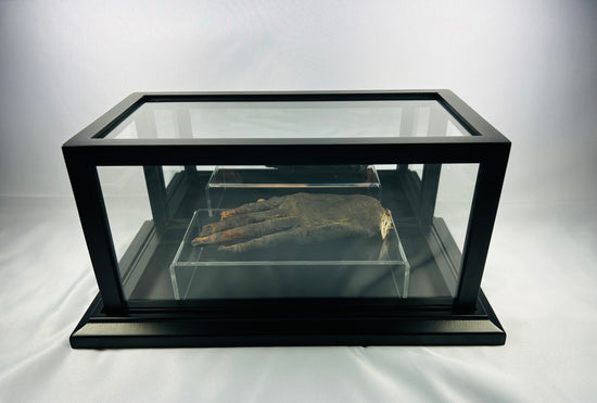 This artifact is presented in a custom protective display case with a sleek black background, ensuring optimal preservation while emphasizing its dramatic silhouette and intricate details.