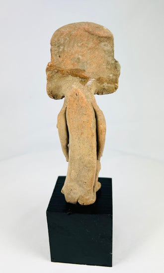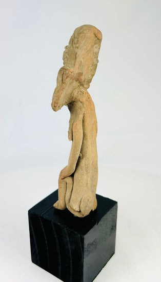 Mold-made and hand-finished terracotta figures like this were widely produced in Teotihuacan and neighboring Gulf Coast workshops. They were placed in burials and domestic shrines, likely serving as representations of ancestors, attendants, or ritual participants. Their distinctive headdresses and ear ornaments echo elite attire seen in Teotihuacan murals and Classic Veracruz sculpture, bridging household devotion with broader ceremonial imagery.