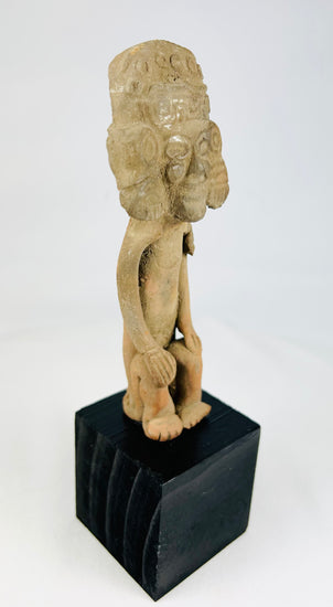Good archaeological condition with expected age wear. Stable old repair horizontally across the headdress. Minor edge nicks, tip wear to fingers and toes, encrustations, and surface abrasions consistent with burial. No active losses. Stands securely on included block.