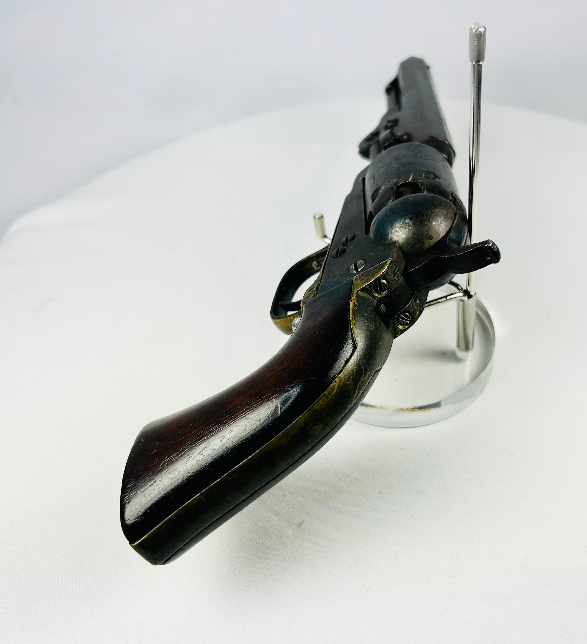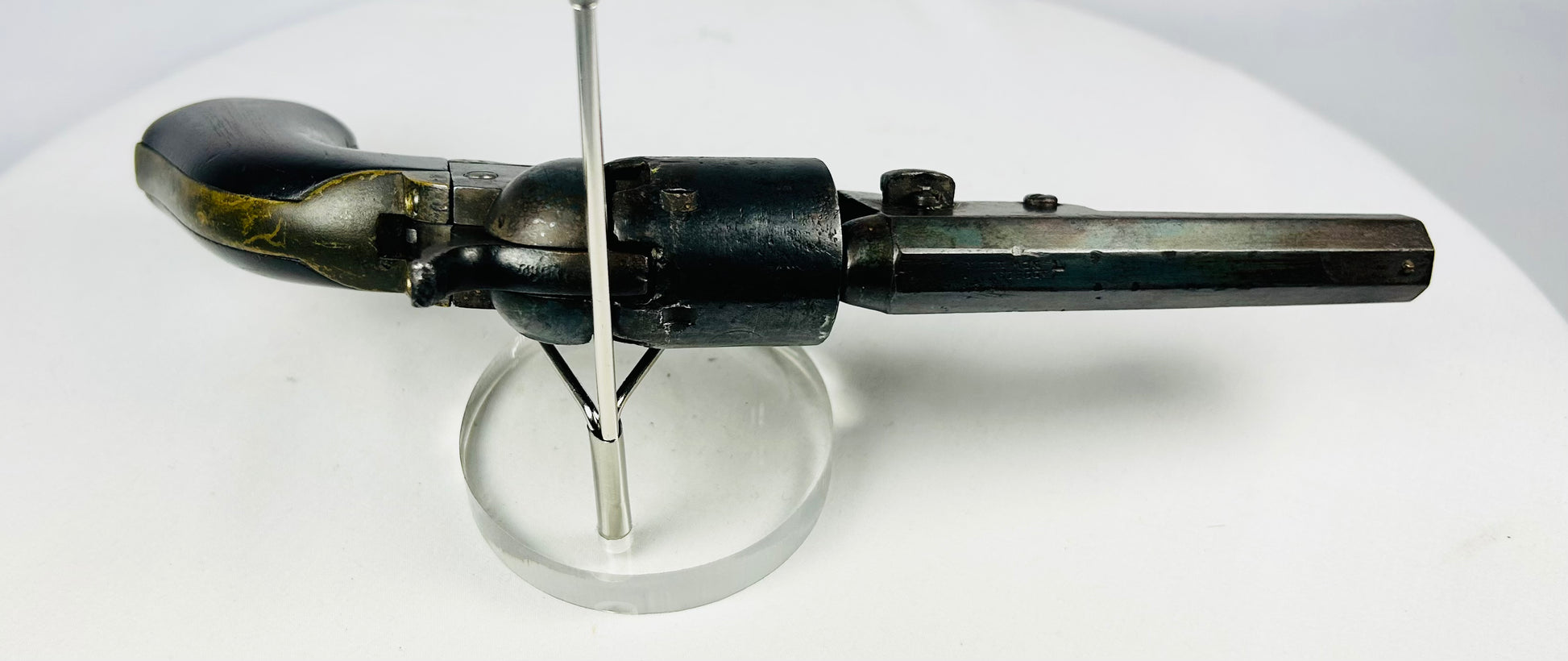 Good antique condition. Surfaces with rich patina and wear consistent with age and use. Cylinder engraving faint but partially visible. Brass elements with even tone. Walnut grip retains varnish with handling marks. Cylinder action functions properly; offered as a collector’s piece only.