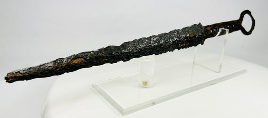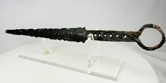 This rare medieval quillon dagger dates to the 14th century, a turbulent era in European history when such weapons were indispensable for both combat and daily life. The dagger features a tapered blade designed for thrusting and close-quarters fighting, complemented by a robust crossguard (quillons) that provided essential hand protection. Its distinctive ring pommel offered balance and grip security, while also serving secondary uses as a striking tool or aid in drawing the blade. Favored by knights, soldiers, and civilians alike, the quillon dagger was as much a weapon of war as a symbol of rank and prestige.