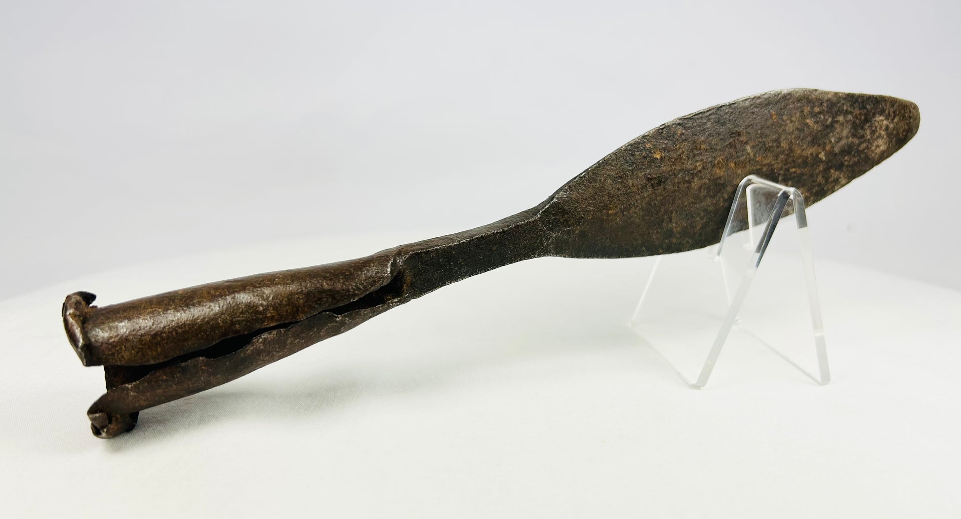 Spearheads such as this were central to European life for centuries, used in hunting, warfare, and ceremonial practices. Their design symbolized power, strength, and status, while also serving as essential tools for survival and defense. This piece reflects the dual role of weapons as both practical instruments and cultural symbols.