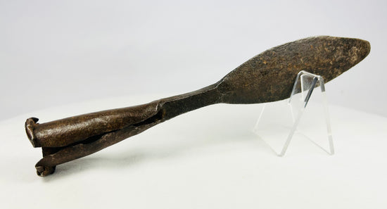 This European socketed spearhead is a remarkable example of early weaponry, crafted with both functionality and artistry in mind. Featuring a double-edged, leaf-shaped blade and a rolled socketed base, the design reflects the advanced metalworking skills of European artisans. Measuring approximately 9.25 inches in length, this spearhead embodies the balance of practicality and symbolism found in historic European arms.