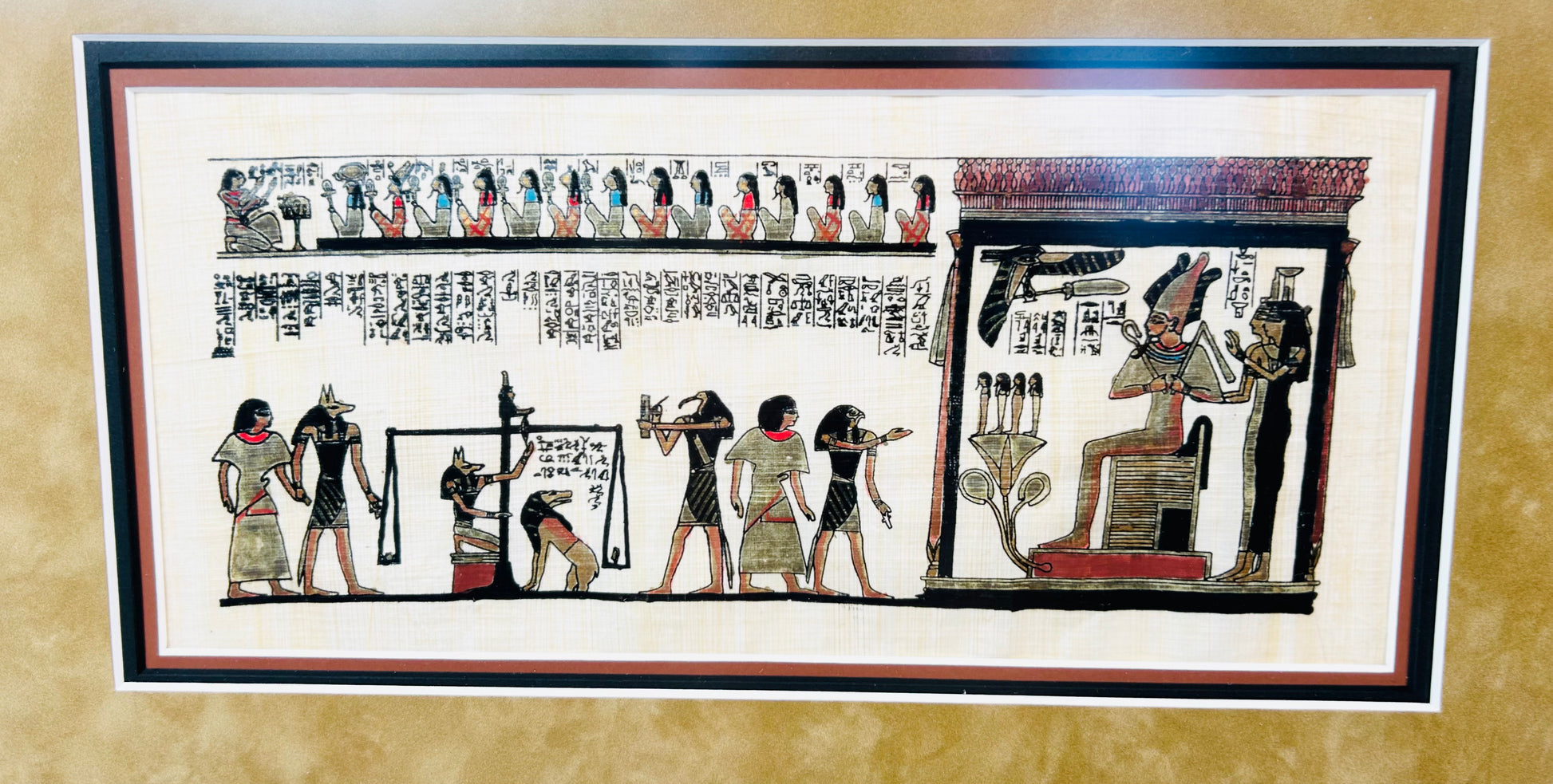 Papyrus artworks provide insight into Ancient Egyptian religious and ceremonial traditions. This piece reproduces scenes inspired by historical funerary texts and rituals, allowing collectors to engage with iconic Nile civilization imagery. The provenance note adds historical and personal context, documenting a modern acquisition in Egypt.
