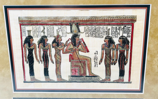This elegantly framed papyrus artwork features two finely detailed panels inspired by Ancient Egyptian funerary and religious iconography. Each panel depicts ritual and ceremonial scenes, including deities, attendants, and symbolic hieroglyphs. Professionally double-matted with rich gold-tone accents and housed in a high-quality wood frame with glass front, the piece captures the iconic artistry and visual storytelling of Egyptian culture.