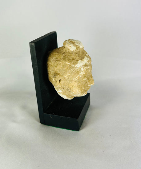 Despite natural wear, fine remnants of original detailing remain visible, testifying to the sculpture’s great antiquity and long historical journey. Mounted on a modern black display stand for stability and presentation.