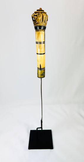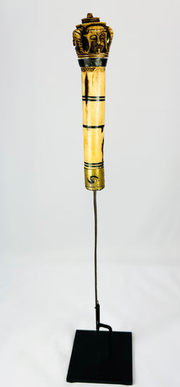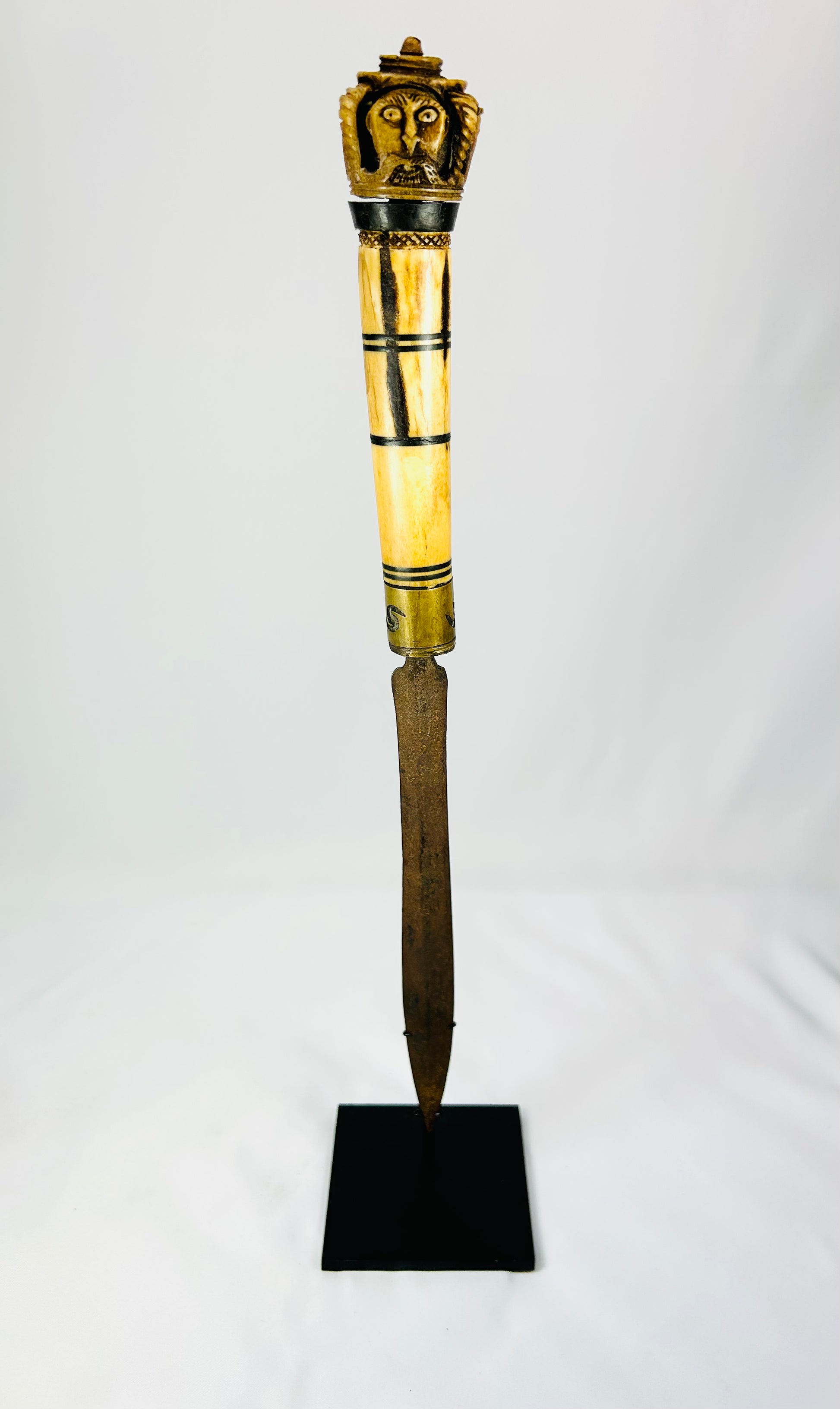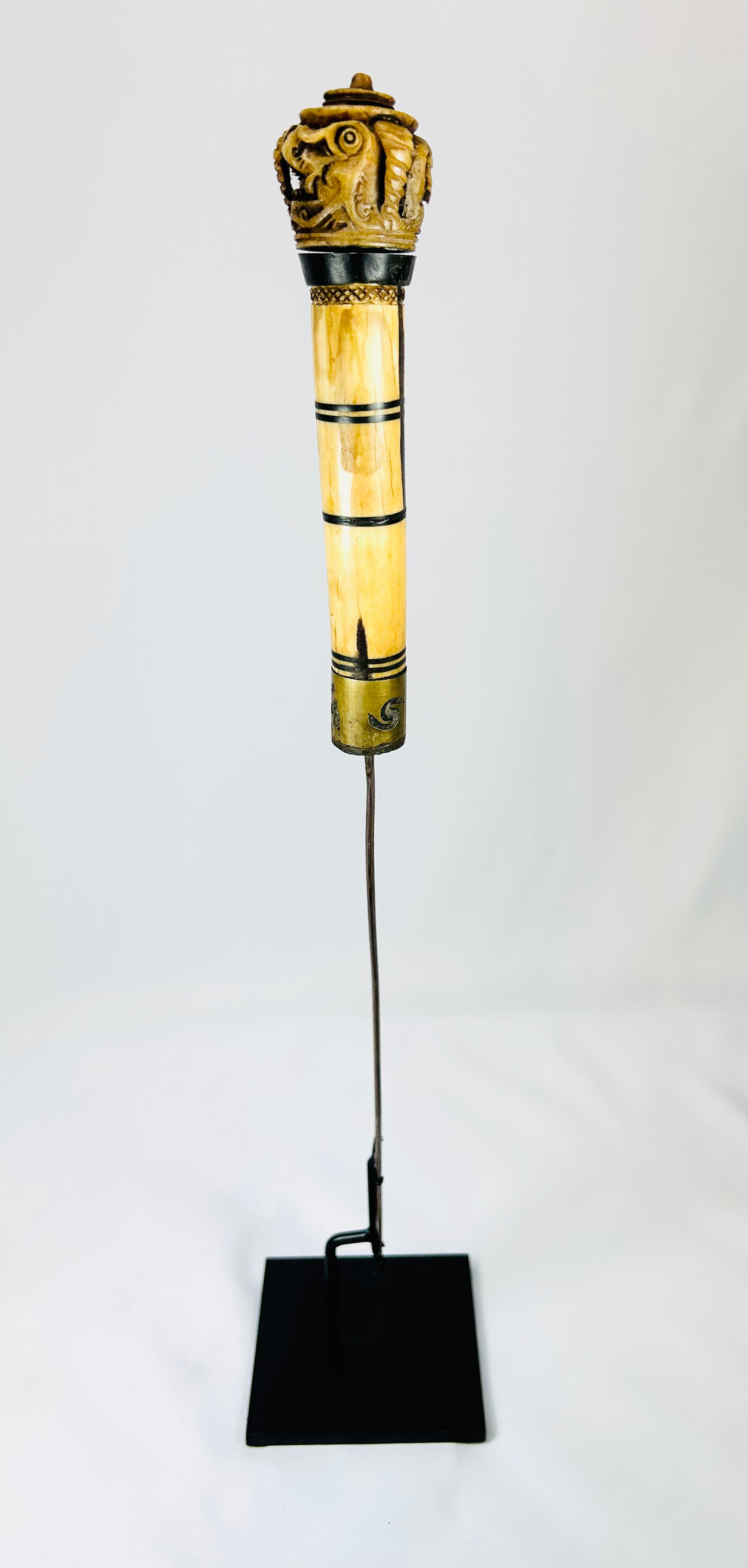 This 19th-century Indonesian knife features a beautifully carved bone handle, showcasing the intricate artistry and cultural symbolism of the Dayak people of Borneo. The handle is adorned with two detailed figures: one side depicts an Aso—a composite mythological beast combining elements of dog and dragon—while the other side features an expressive male figure with an elaborate mustache.