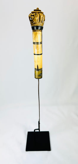 - Hand-carved bone handle depicting an Aso guardian beast and a male figure with elaborate mustache