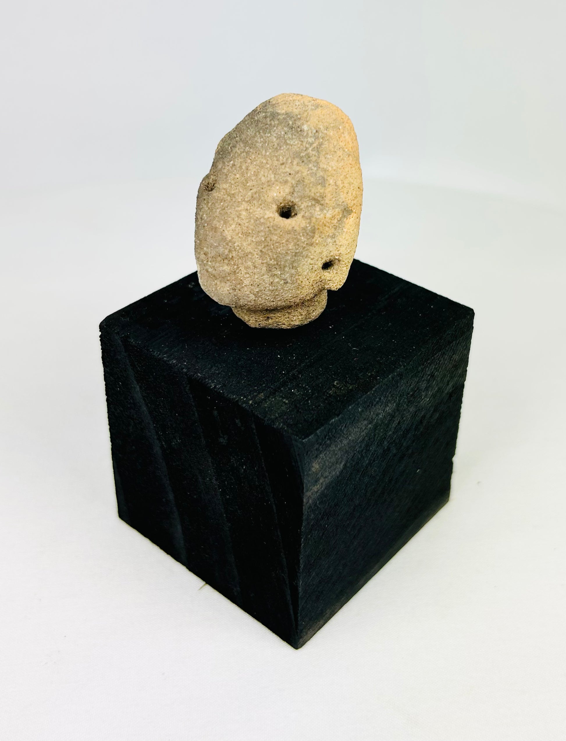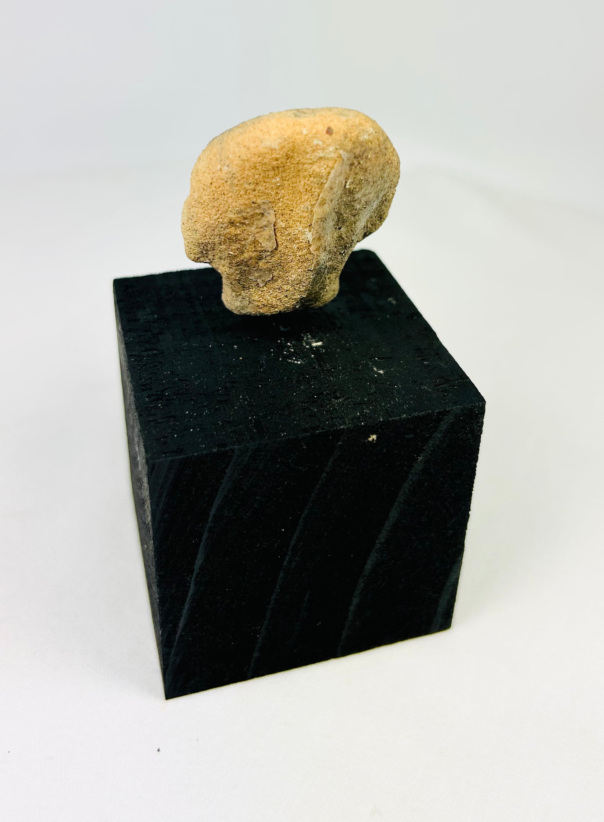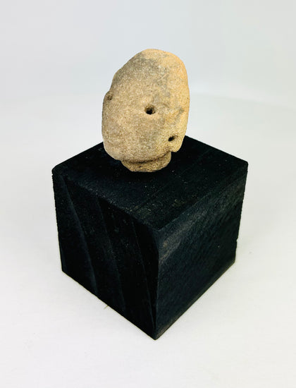 Fragmentary head only, with surface weathering, encrustations, and soil deposits from burial. Stable, with no modern restoration. Mounted on a custom museum-style display stand.
