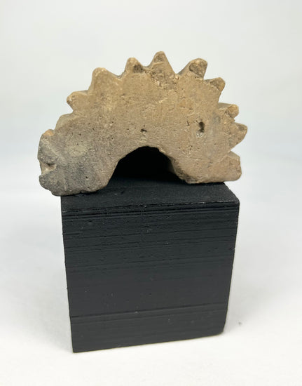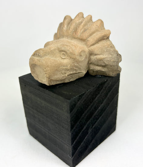 This finely carved stone fragment depicts the head of a fierce animal, its open mouth and radiating mane or spiked crest suggesting a guardian beast such as a jaguar or lion-like deity. The stylized carving emphasizes strength and protective power, central themes in Mesoamerican art and spirituality. Though once part of a larger architectural or ritual piece, the fragment retains strong detail in the muzzle, eyes, and crest. Now mounted on a custom black display base, it presents as both an archaeological artifact and a striking sculptural fragment.