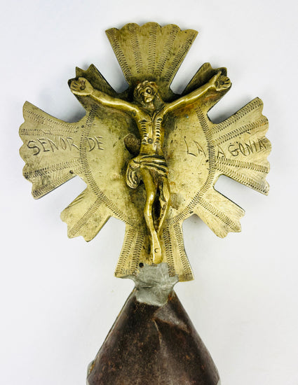 Spanish Colonial Brass Processional Cross Finial | Double-Sided Crucifix & Saint | 18th–19th Century