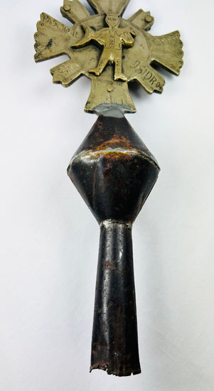 A rare Spanish Colonial processional cross finial, cast in double-sided form. One side presents a crucifix with Christ on the cross, framed by radiating sunburst arms and engraved with the inscription “Señor de la Agonía” (Lord of Agony). The reverse depicts a saintly figure holding a fish, inscribed “Fundador Pascual Isidro”—likely honoring the founder of a confraternity or religious brotherhood. Originally mounted atop a wooden staff, this finial embodies both craftsmanship and devotional function within Spanish Colonial Catholic tradition.