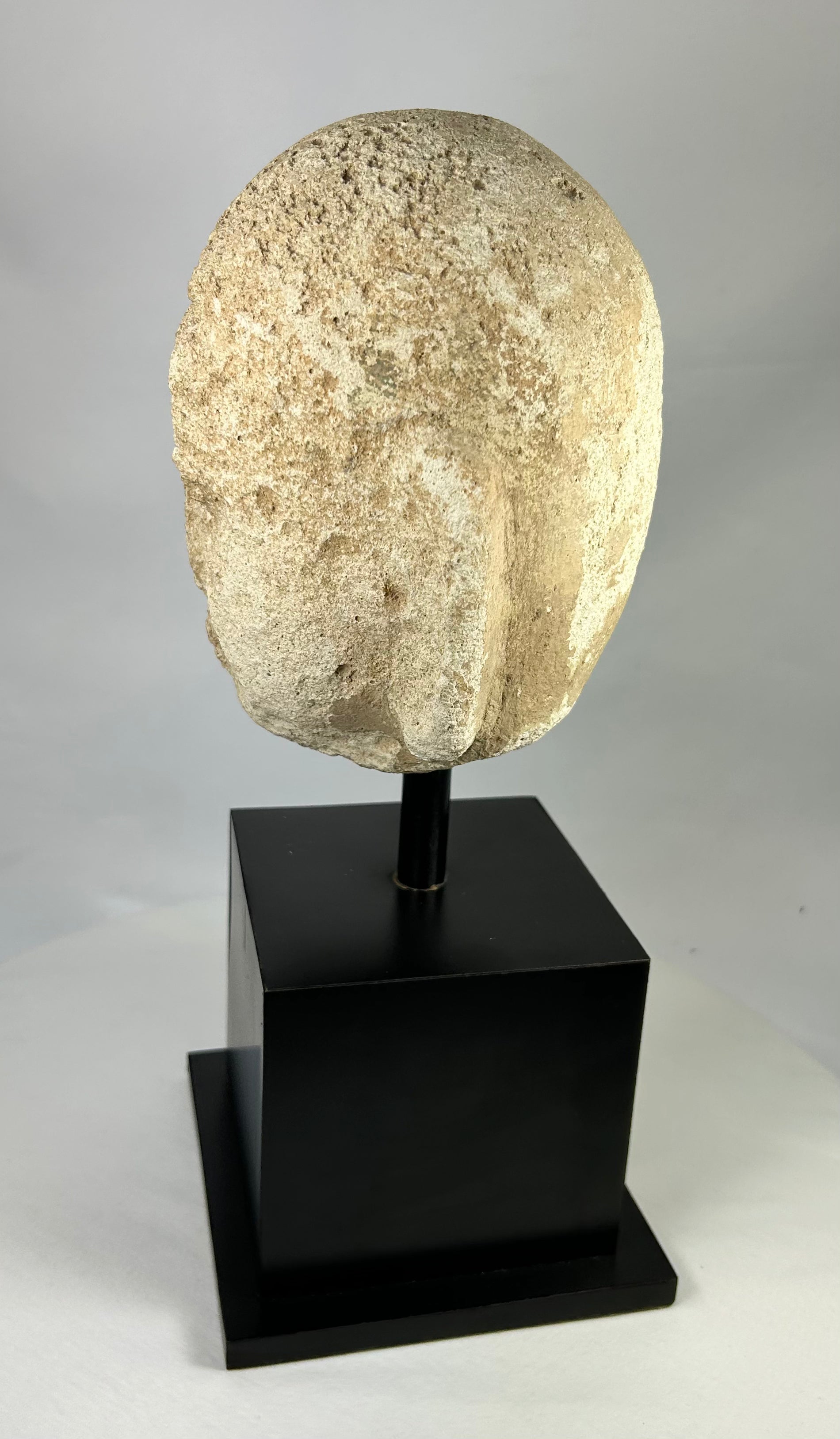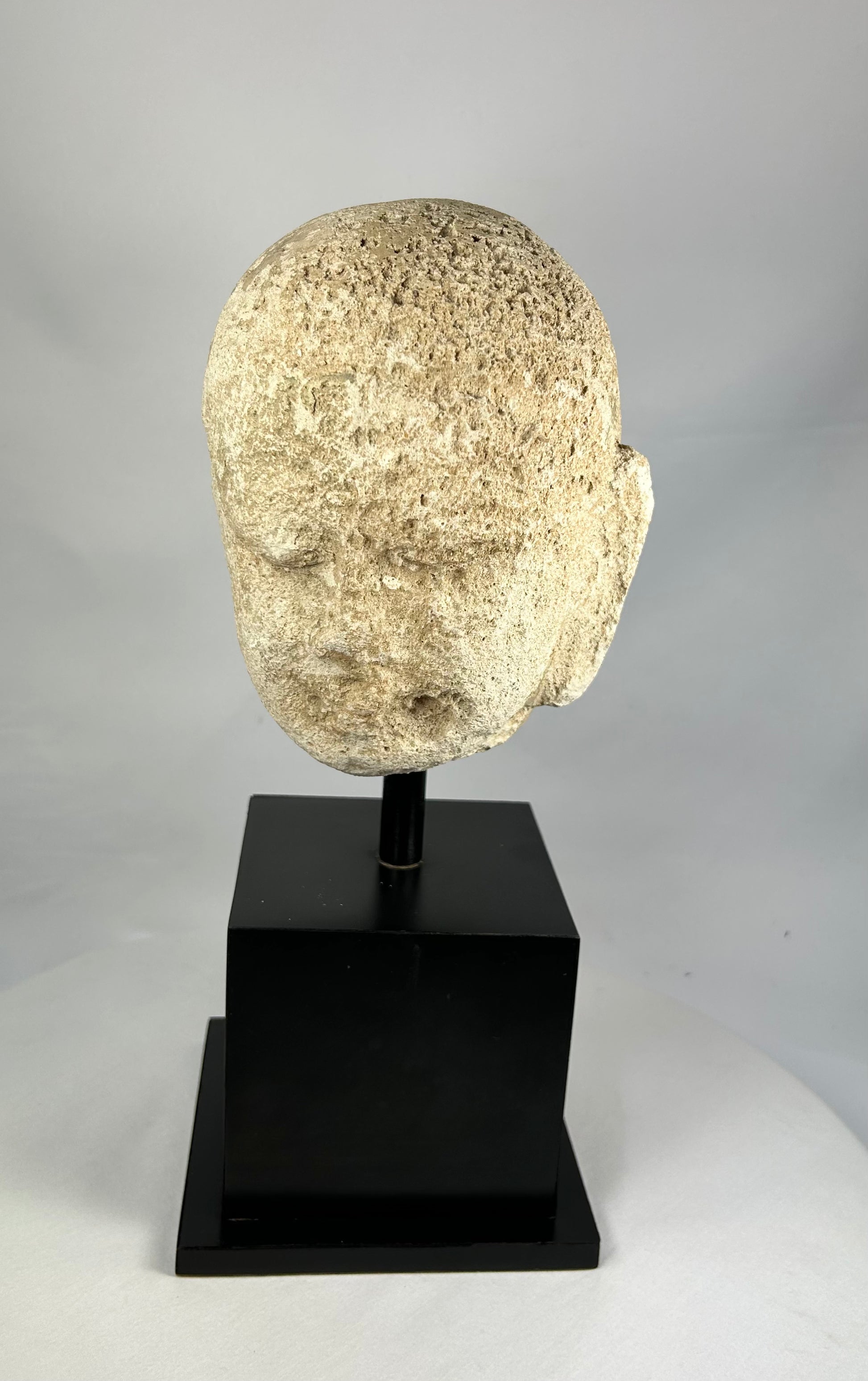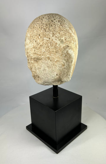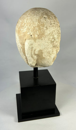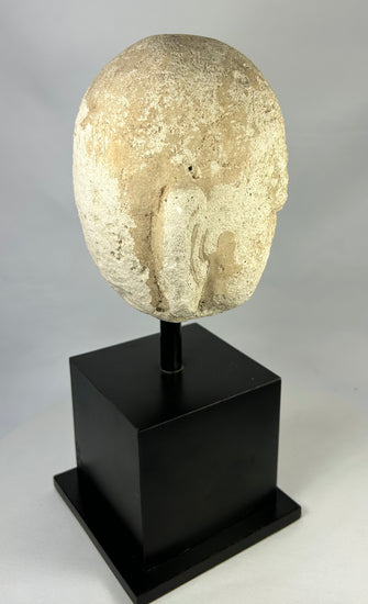 This striking Buddha head sculpture, carved from durable stone, reflects the spiritual depth and refined artistry of Southeast Asian Buddhist sculpture during the 13th–14th centuries. Measuring approximately 12.2 inches in height, the head features serene facial contours, closed meditative eyes, and delicate detailing that embody the ideals of peace and enlightenment. Its weathered patina attests to centuries of age, while the modern black stand provides elegant support for display.