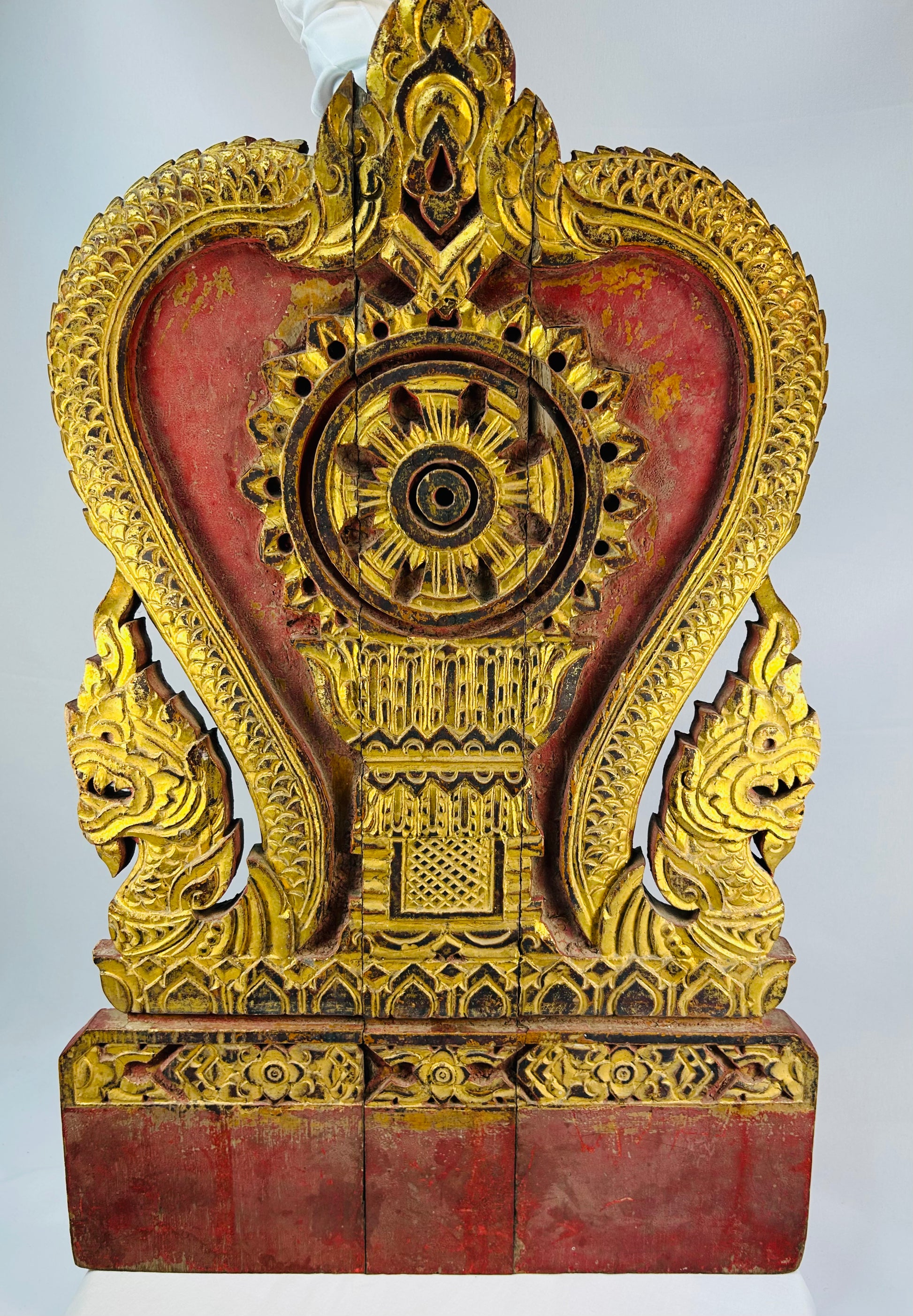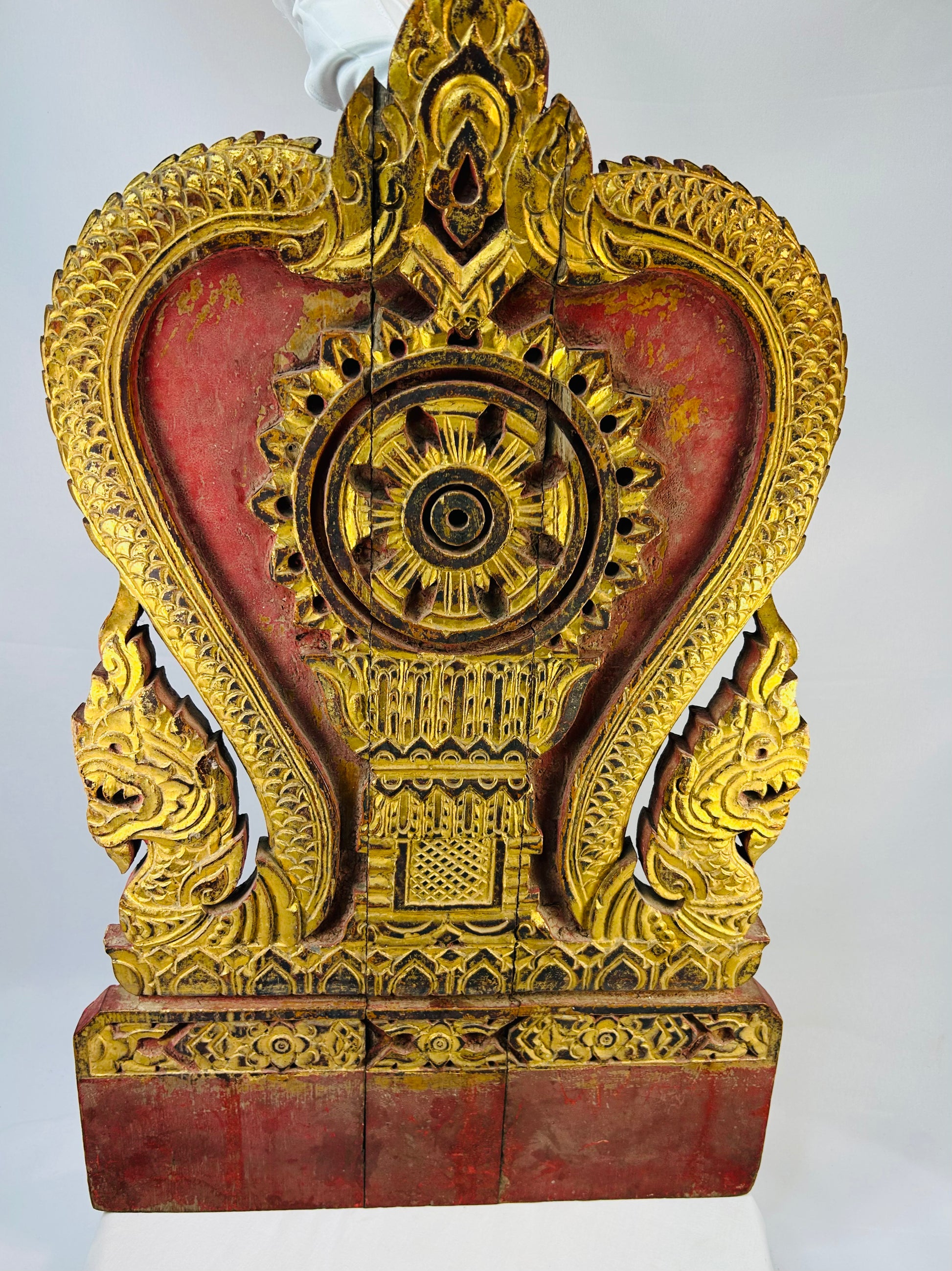 Impressive architectural shrine panel richly carved in high relief and gilded over red lacquer. At center is a dharmachakra (Wheel of the Law) within a foliate aureole, flanked by confronting naga serpents that rise from a lotus-like base and curl along the border in scale pattern. The crest terminates in a flame-shaped kranok finial—classic Thai Buddhist ornament. Likely produced as a decorative element for a temple altar/throne back or as an interior architectural panel and later fitted for wall display.