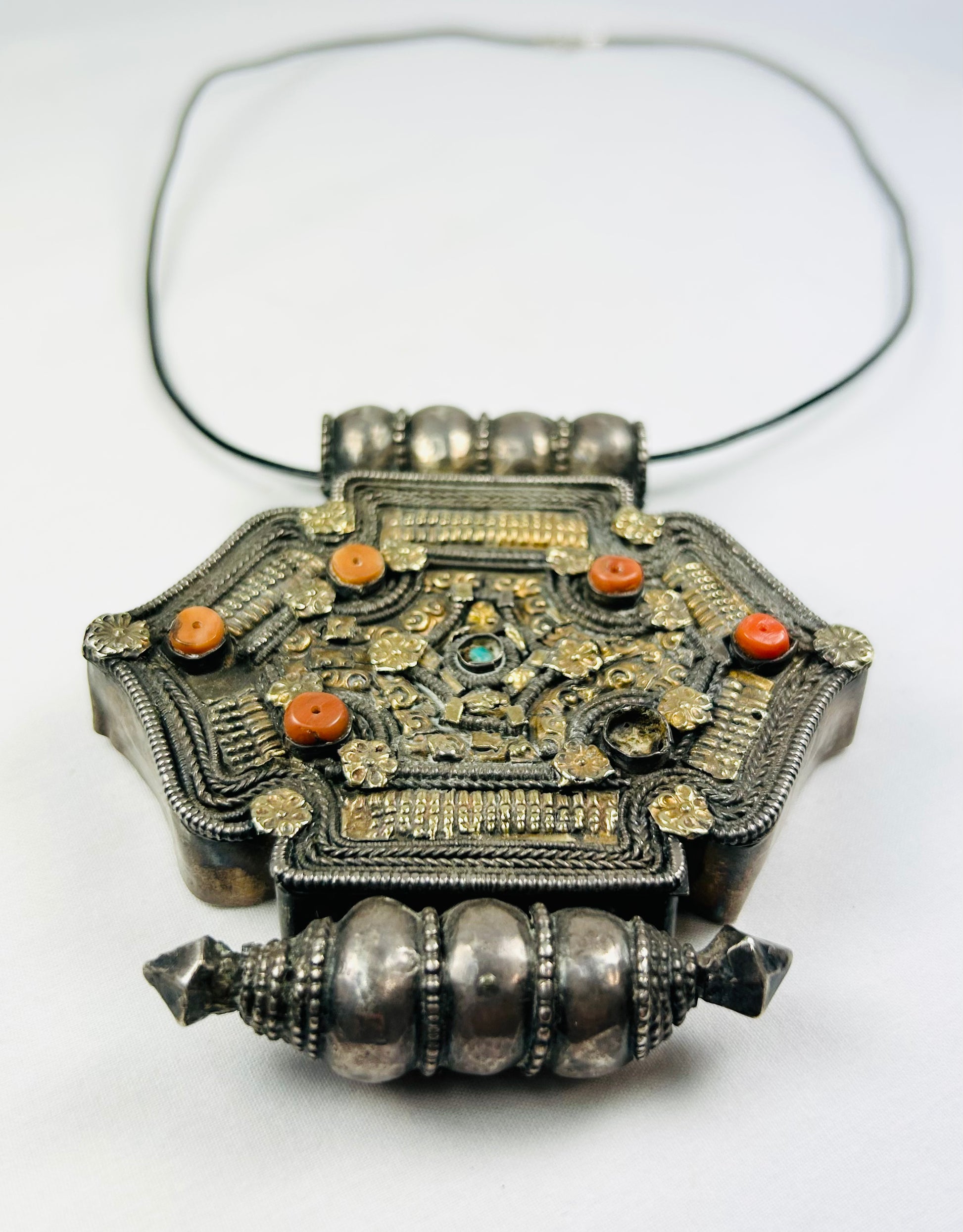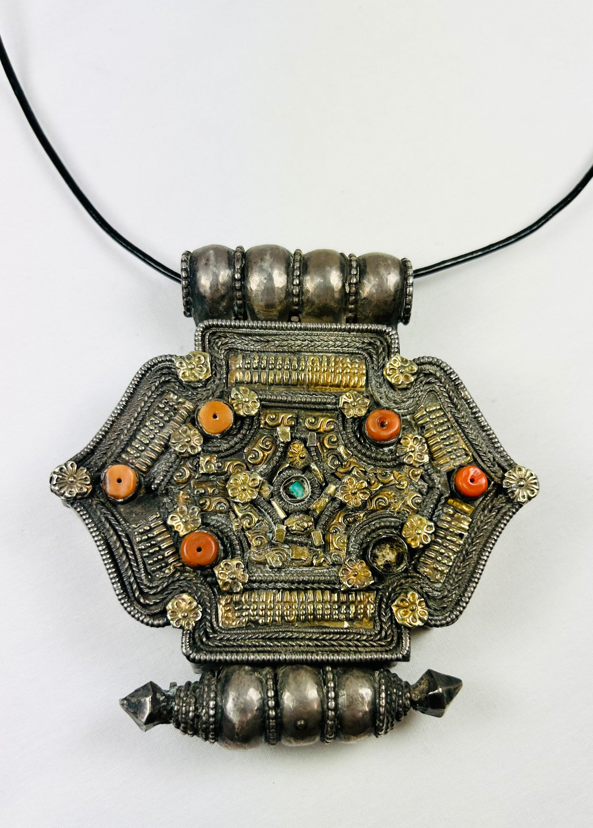 Gau pendants served as portable shrines in Tibetan and Nepalese practice, worn on the chest during travel and ritual to carry protective texts, relics, or votive substances. The combination of coral and turquoise is emblematic in Himalayan jewelry, symbolizing vitality and protection.