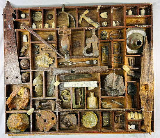 Material: Mixed metals (iron, brass, lead), glass/ceramic, wood display tray with wire mounts