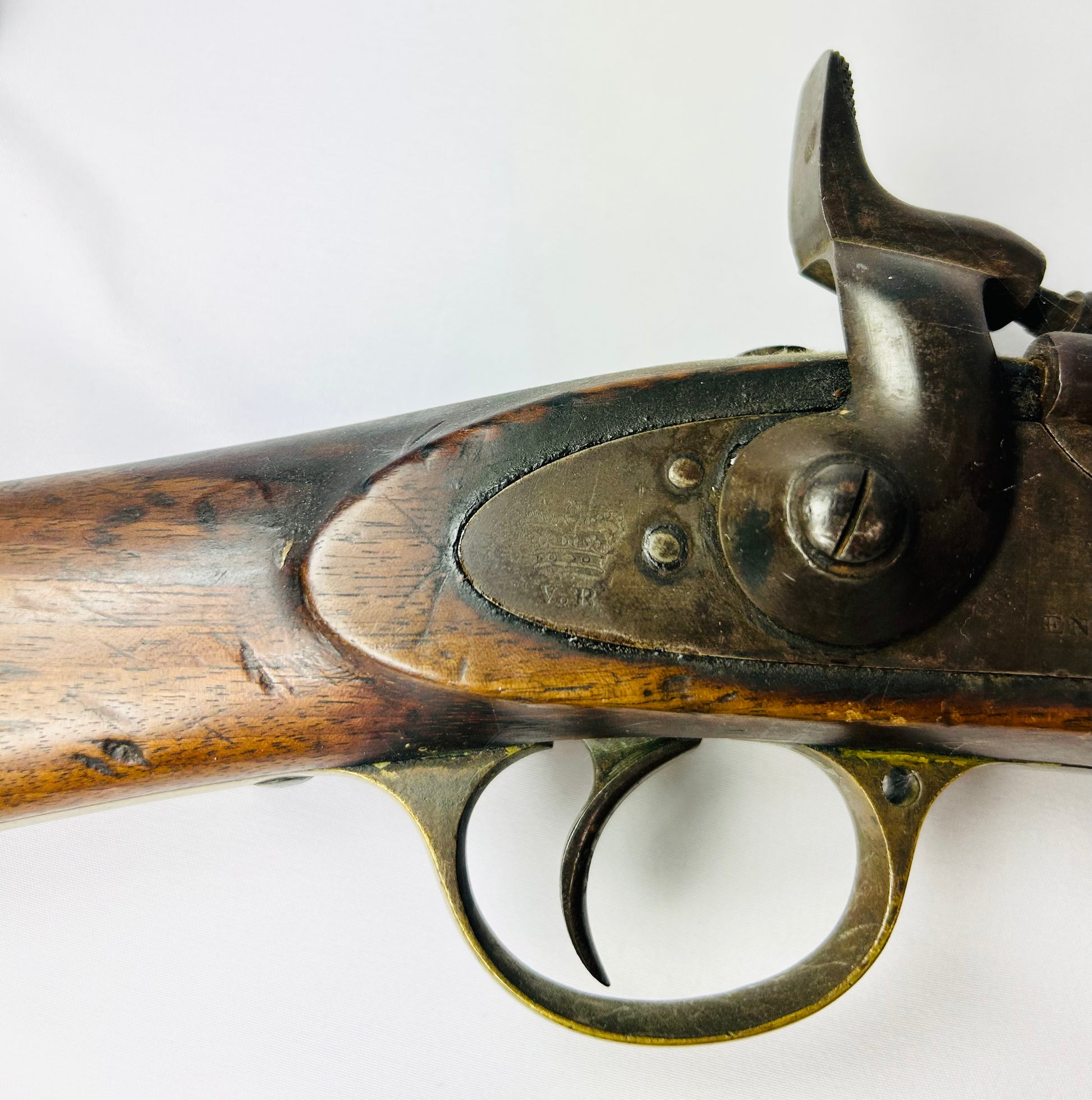 The lockplate is crisply stamped “ENFIELD 1864” beneath Queen Victoria’s crown and cypher (“VR”), with additional military inspection and proof marks throughout the steel fittings. The rifle features the hinged breechblock system characteristic of the Mk II conversions, along with its original brass trigger guard and butt plate. The walnut stock bears the warm, worn patina of active service, showing clear signs of field use.